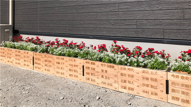 落成式に間に合うよう建物の柱などに使った小国杉で加工したプランターカバーへ