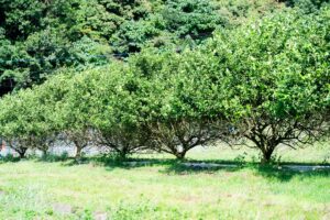 芦北高校の裏手の山にある果樹園、スイートスプリングや甘夏などいろんな柑橘が植えてあります。しかし分かるでしょうか、下4分の1ほどの高さの葉っぱが全然ありませんよね。