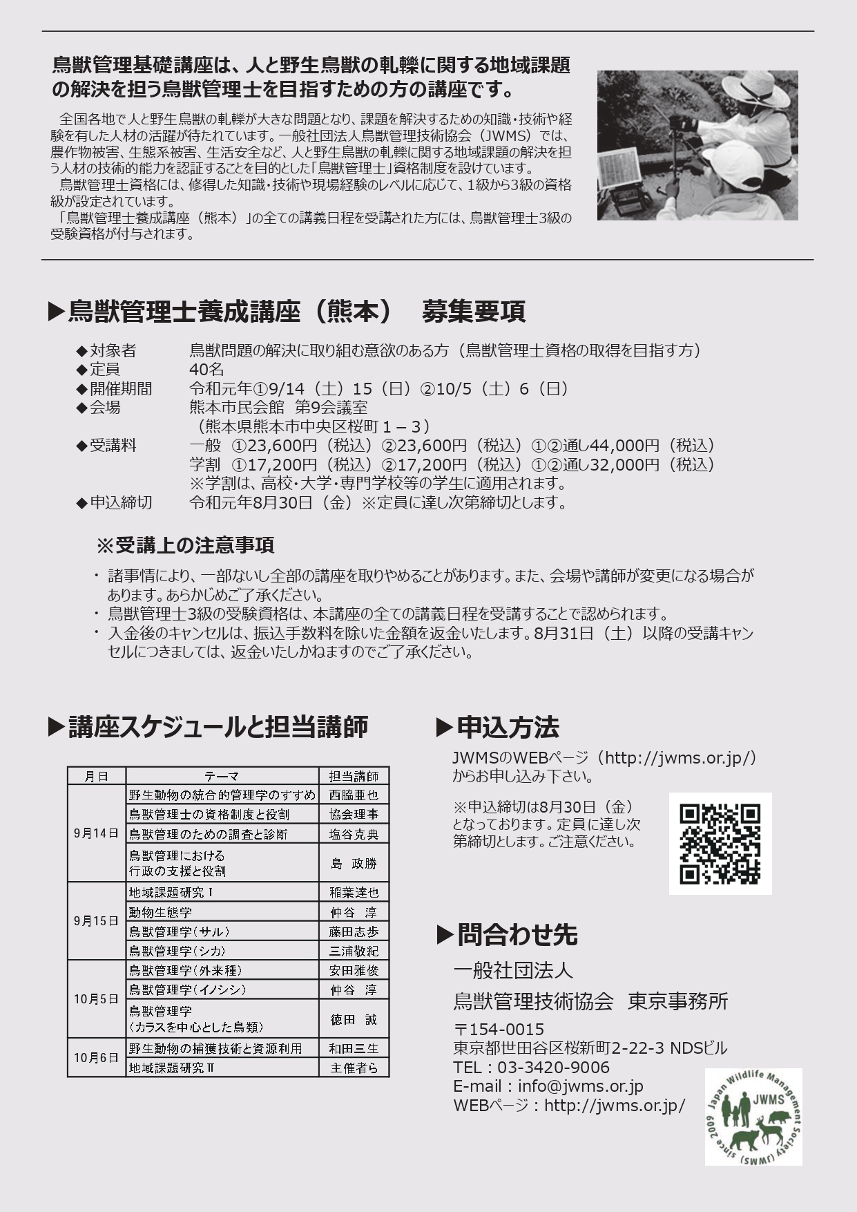 昨年、北海道 栃木 東京 大阪で行われた鳥獣管理士養成講座が、今年ついに熊本でも開催される事になりました🎊