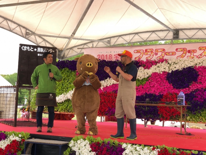 毎年4月に開催される「宇城市フラワーフェスタ」 高校生が作った花のオブジェが華やかな 大人から子どもまで楽しめるイベントです。 今回、宇城市からご依頼をいただきステージで 農家が鳥獣被害に困っていることや、その対策として イノシシの生態にふれつつクイズも交えて 電気柵や箱罠について話をさせていただきました。 イノシシのはなちゃんに協力してもらったこともあり 子どもたちにも興味をもってもらえたかな? たくさん声をかけてもらって、握手したり写真を撮ったり 大人気なはなちゃんでした。 お声をかけてくださった宇城市の職員の方 ありがとうございます。