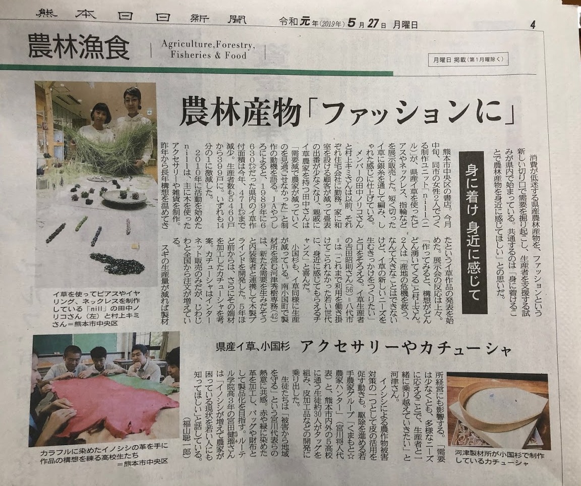 今年3月からスタートしている くまもと☆農家ハンター×高校生との商品開発プロジェクト その様子が熊本日日新聞で紹介されました。 農林産物「ファッションに」というタイトルで 他の方の取組みと合わせて掲載されていて