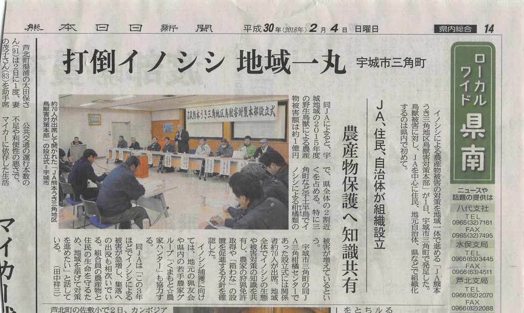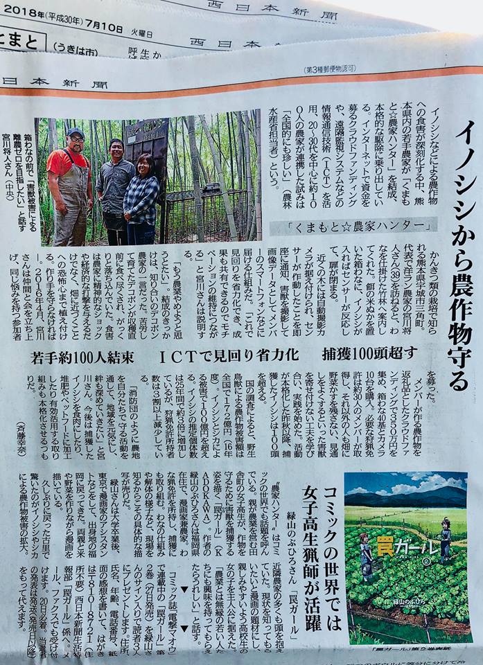 西日本新聞さんに私たちの活動を掲載していただきました。 さらに、先日直筆のサインをアップいたしました「罠ガール」の緑山先生。 ご自身も農家でありハンターである点が共通しており一緒に 掲載していただき光栄です。 「害獣被害による離農ゼロ」を目指してがんばって参ります。![]()