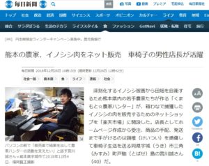 熊本の農家、イノシシ肉をネット販売 車椅子の男性店長活躍 https://mainichi.jp/articles/20181226/k00/00m/040/041000c くまもと☆農家ハンターのメンバーの宮川誠さん 代表の宮川将人とはお隣さん、幼馴染(親戚ではありません) その誠さんが店長を務める「農家ハンターSHOP」 楽天市場に先日よりオープンしています。 イノシシのジビエやイノシシの被害に合わなかった 農作物、地域の海産物を販売するオンラインショップです。 誠さんに経歴から、農家ハンターの取組みまで 書いてくださり、年の瀬にとってもいいニュースでした! 因みにニコニコニュースでも紹介されていました。 来年は亥年でもありますし、飛躍の年にしたいです☆ 楽天市場「農家ハンターSHOP」はこちら 古くから万病に効くといわれるイノシシ肉 無病息災を願って食べてみませんか?