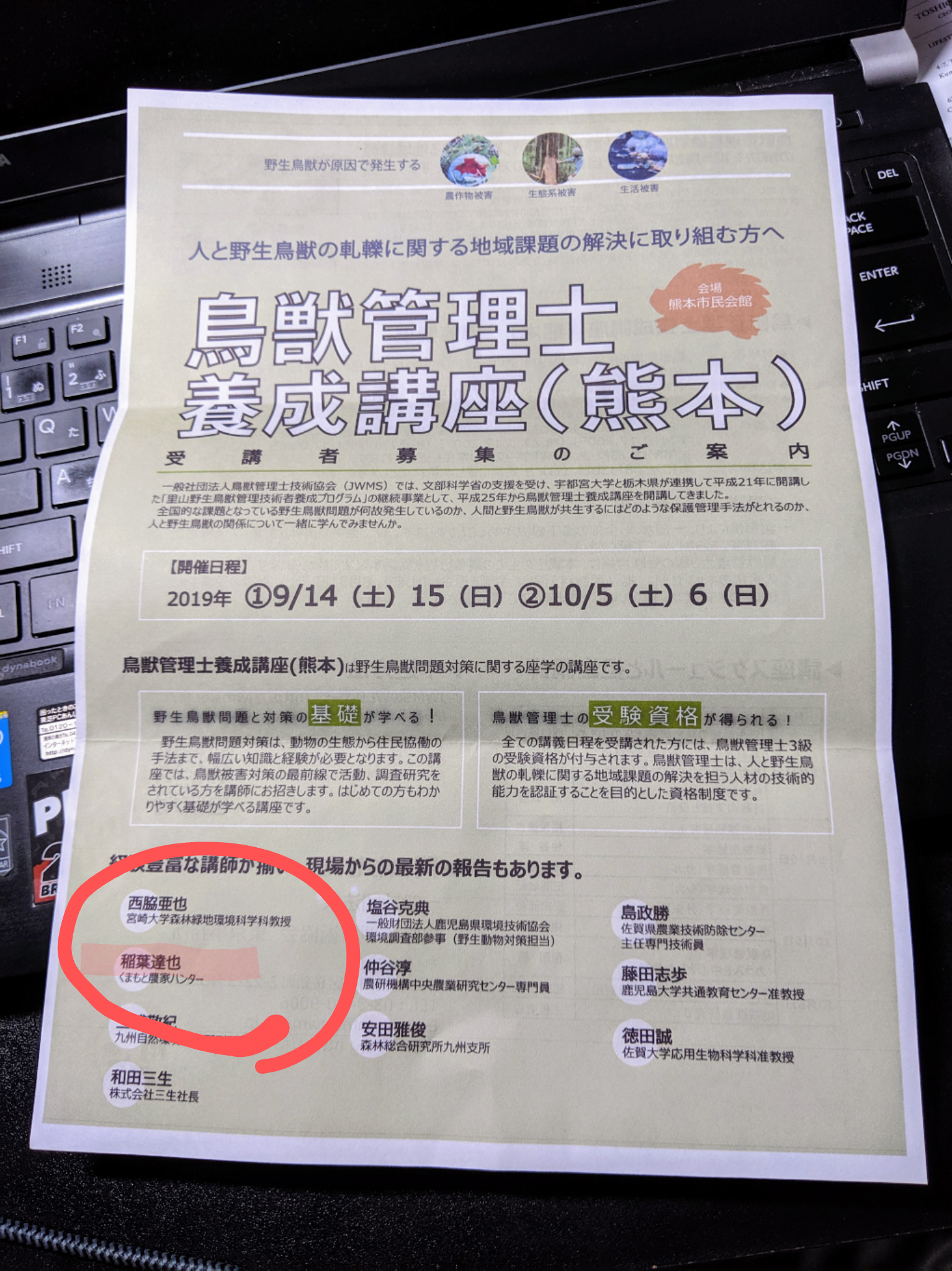 以前、お知らせした鳥獣管理士養成講座の初日が行われました!!
