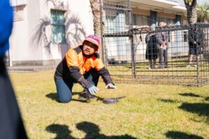 箱罠の中に生徒さんが入りました。イノシシのマネの上手なこと!笑