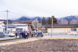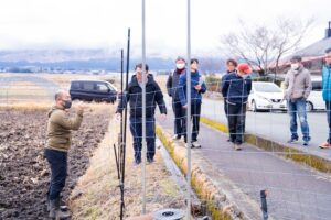 この田んぼは5年前からイノシシさんに好まれるようになりましたが、昨年は被害が特にひどく、「もうどうでもいいか……」という気持ちになってしまったと地主の方は話されました。この地域で守るべき畑はたくさんあり、その一歩目としてここに柵を設置することになったのでした。この地域で金網柵を導入するのはこの日が初めてです。選定の理由は、ここが通り道からも見えて、守れているか(動物が侵入していないか)みんなで確認・検証がしやすいということでモニタリングの要素もあるようでした。