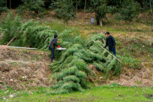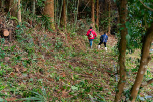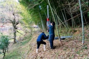 山ぎわは、柵の管理や草刈りがしやすいように竹を切って広げます。最初のこの手間が重要です。