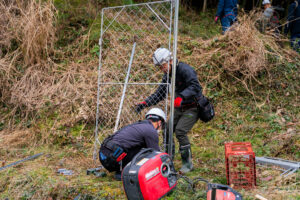 扉設置部隊。軽トラも行き来できる扉がつけられるところも金網柵の利点です。最初は手間がかかりますが、最初にがんばればその後の動きや管理などのストレスが少なく済むのが金網柵です。